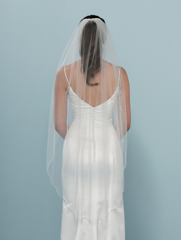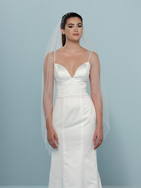 Enkellaagse ivoorkleurige soft-tule sluier, delicaat geborduurd met zilverdraad in golfvorm, versierd met kristallen en pailletjes